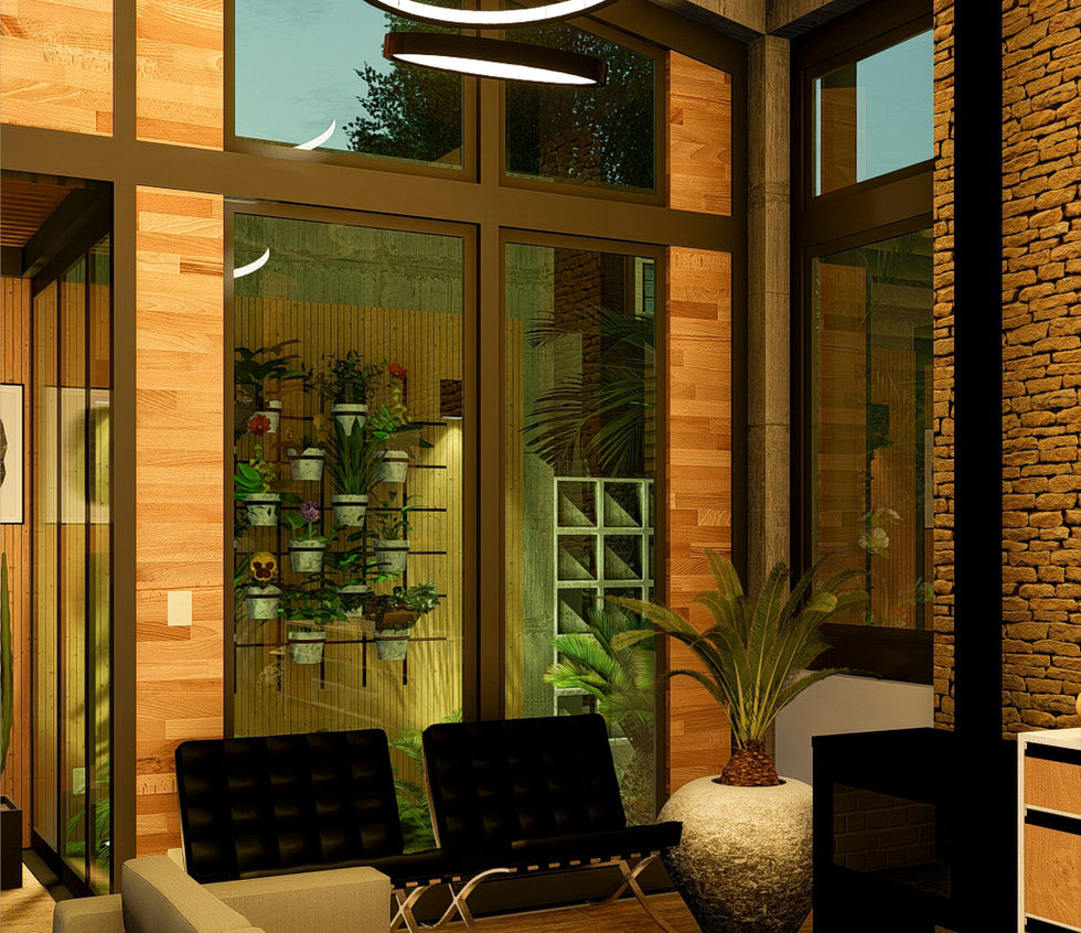 valorização da iluminação e ventilação naturais, volumetrias puras e conceituais trazem a privacidade da entrada e a transparência da casa como um todo; a separação entre áreas comuns e áreas privadas através de jardins internos completam a volumetria do conjunto.